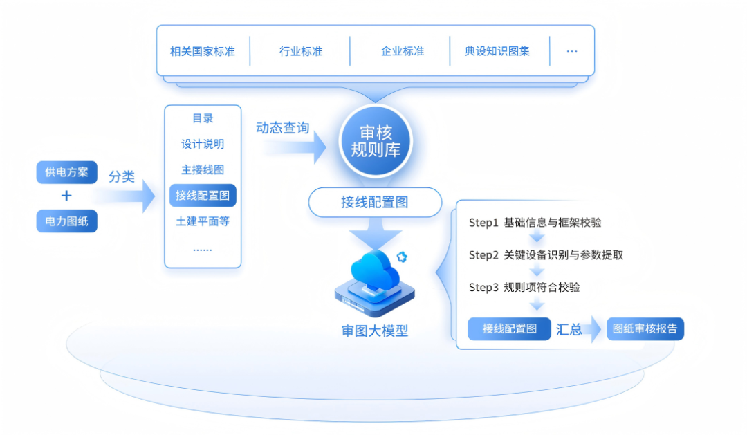 智能审图平台并不是以“黑盒”方式直接给出结论,而是围绕电力审图业务,构建了一套“规则驱动+智能识别+证据定位+自动报告”的闭环流程。平台以审核规则为核心,以自研的多模态审图大模型为支撑,对图纸进行分类识别、关键信息提取、规则匹配和符合性校核,让审图过程建立在明确依据之上,形成“规则有来源、问题可定位、结果可复核”的工作机制。
