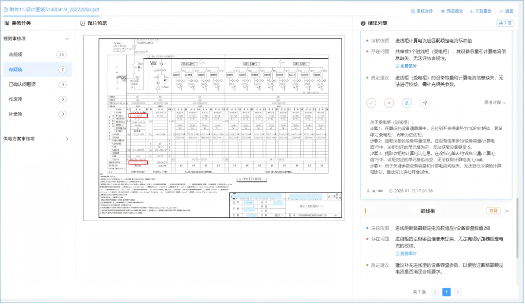 很多关键审核项,并不是看某一页就能得出结论。往往需要结合供电方案、设计说明、一次接线图、接线配置图、材料清单等多个页面综合判断。人工审核时,需要反复翻页、逐项查找、手工对应,耗时长、强依赖经验。